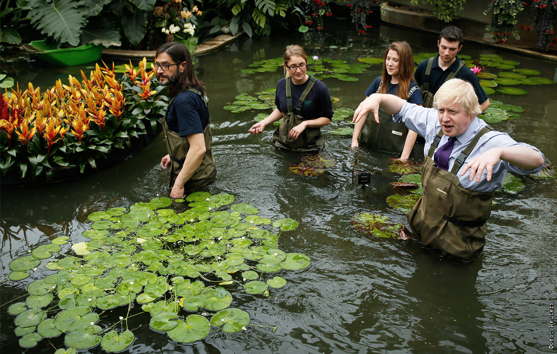 Мэр Лондона сажает водяные лилии в Королевском ботаническом саду Кью. Март 2015 года.