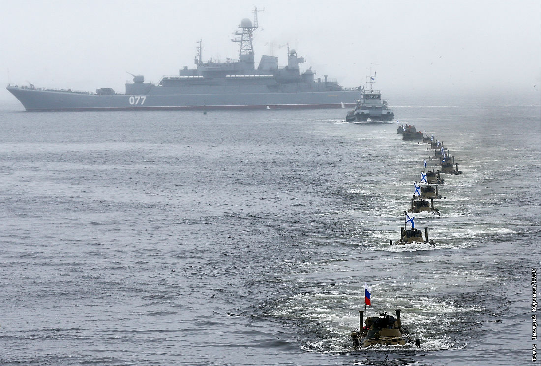 Десантирование бронетранспортеров с большого десантного корабля "Пересвет" во время военно-морского парада в акватории Амурского залива.