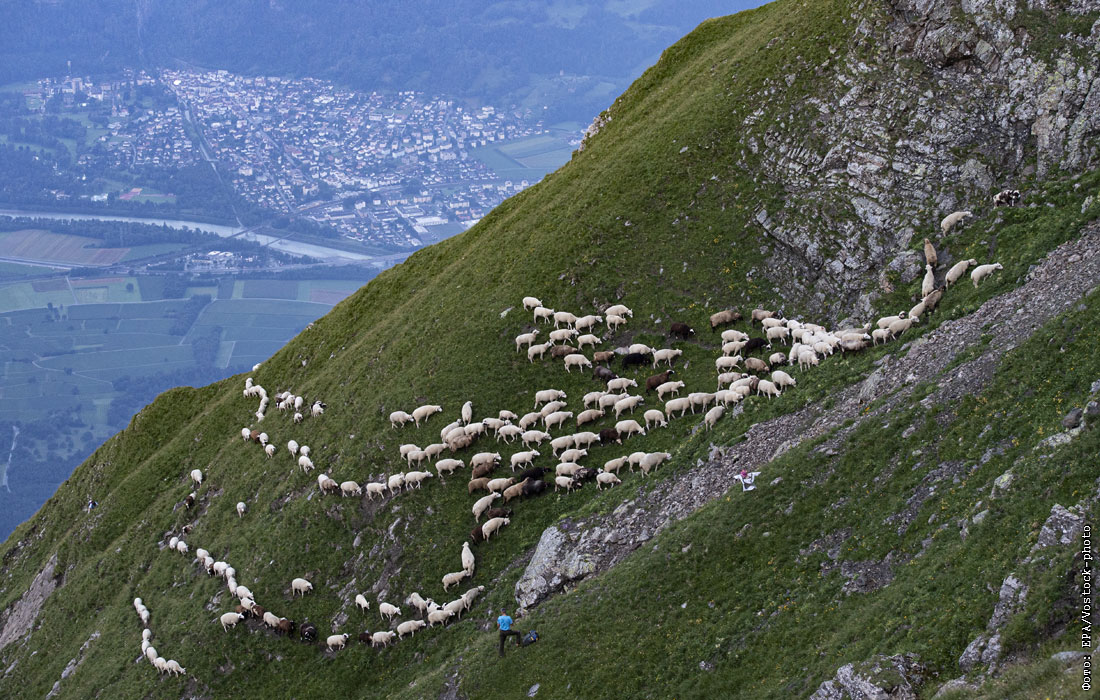 В швейцарских Альпах полторы тысячи овец перегнали на пастбище под пиком Фалькнис (2562 метра над уровнем моря). Это традиционный маршрут, по которому животных проводят каждый год.