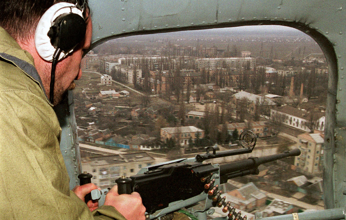 Российский вертолет со стрелком на борту пролетает над столицей Чечни Грозным. 26 января 2000 год.