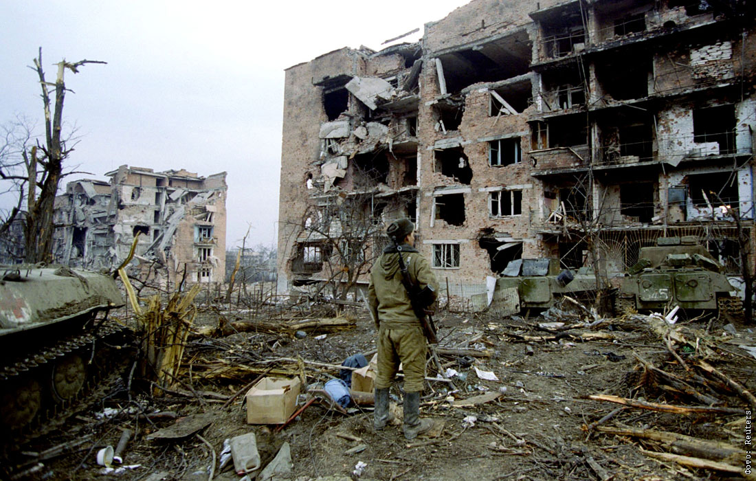 Российский солдат смотрит на разрушенное здание в Старопромысловском районе чеченской столицы. 19 января 2000 год.