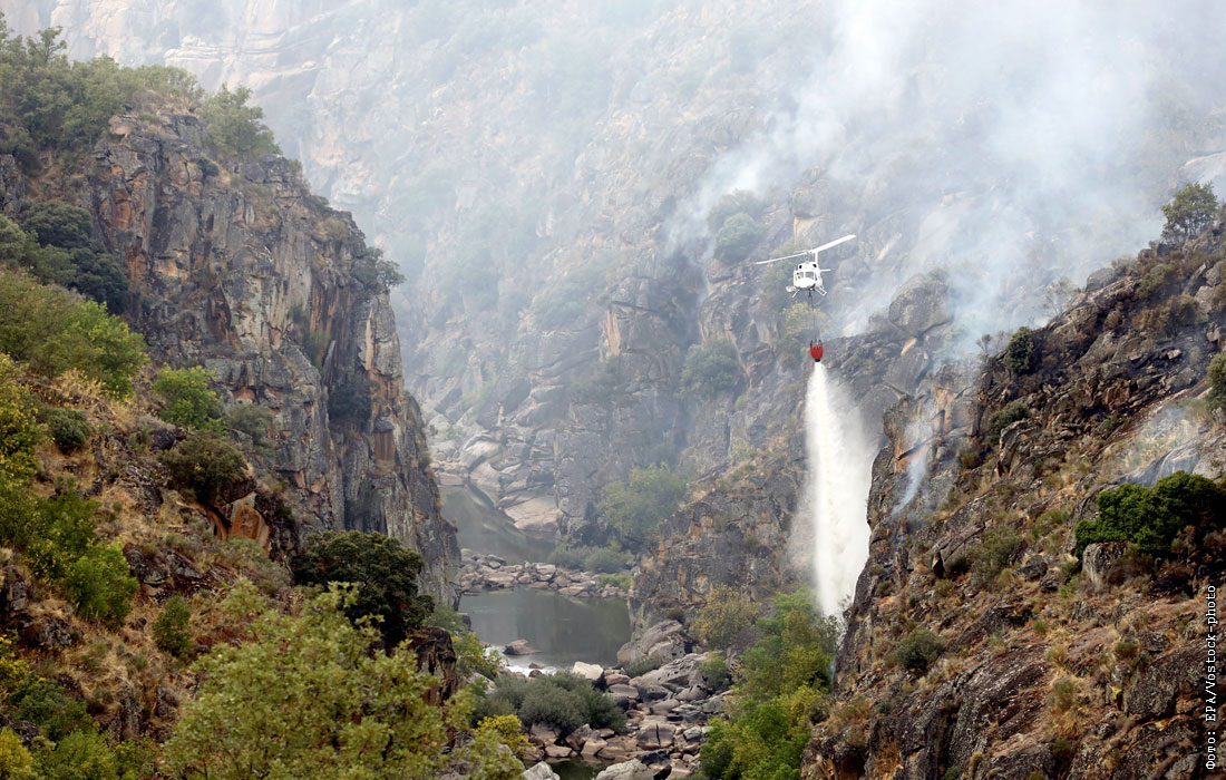 Вертолет сбрасывает воду на лесной пожар вблизи природного парка Аррибес-дель-Дуэров в Саламанке, Испания