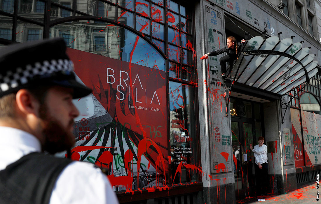В Лондоне демонстранты облили красной краской посольство Бразилии в знак протеста против уничтожения тропических лесов Амазонки и насилия над коренными народами, проживающими там