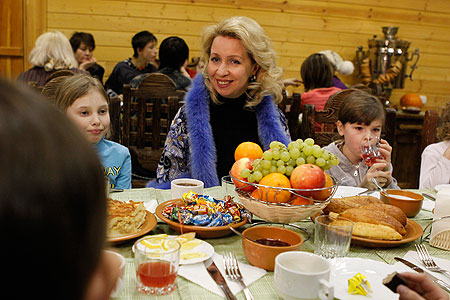 Супруга президента России Светлана Медведева с воспитанниками детских домов во время празднования Масленицы в "Коломенском"