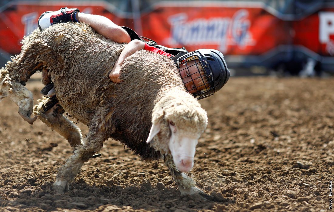 Мальчик катается на овце на ярмарке штата Айова в США