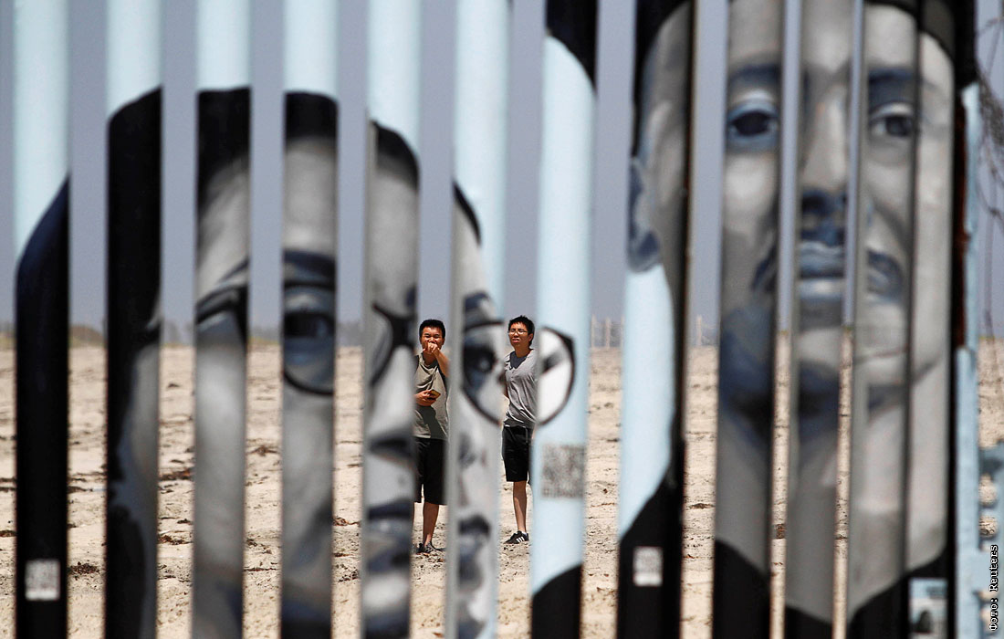 Туристы смотрят на стену разделяющую Мексику и США в Тихуане