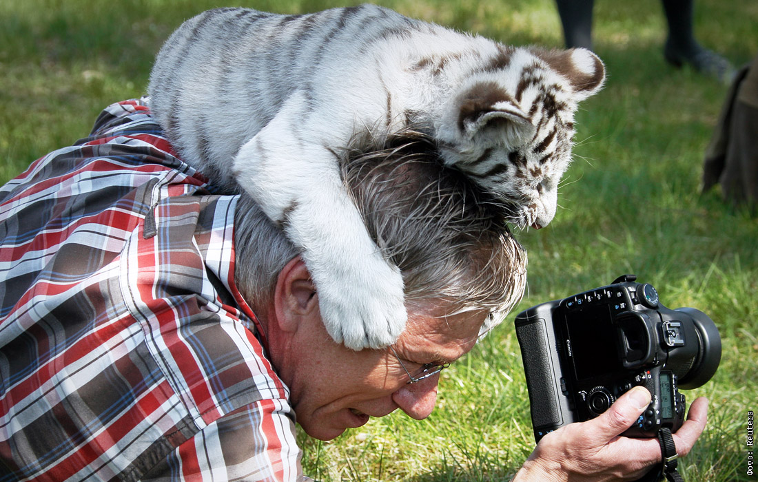Бенгальский тигренок играет с фотографом в сафари-парке "Штукенброк" в Германии. Апрель 2011 года.