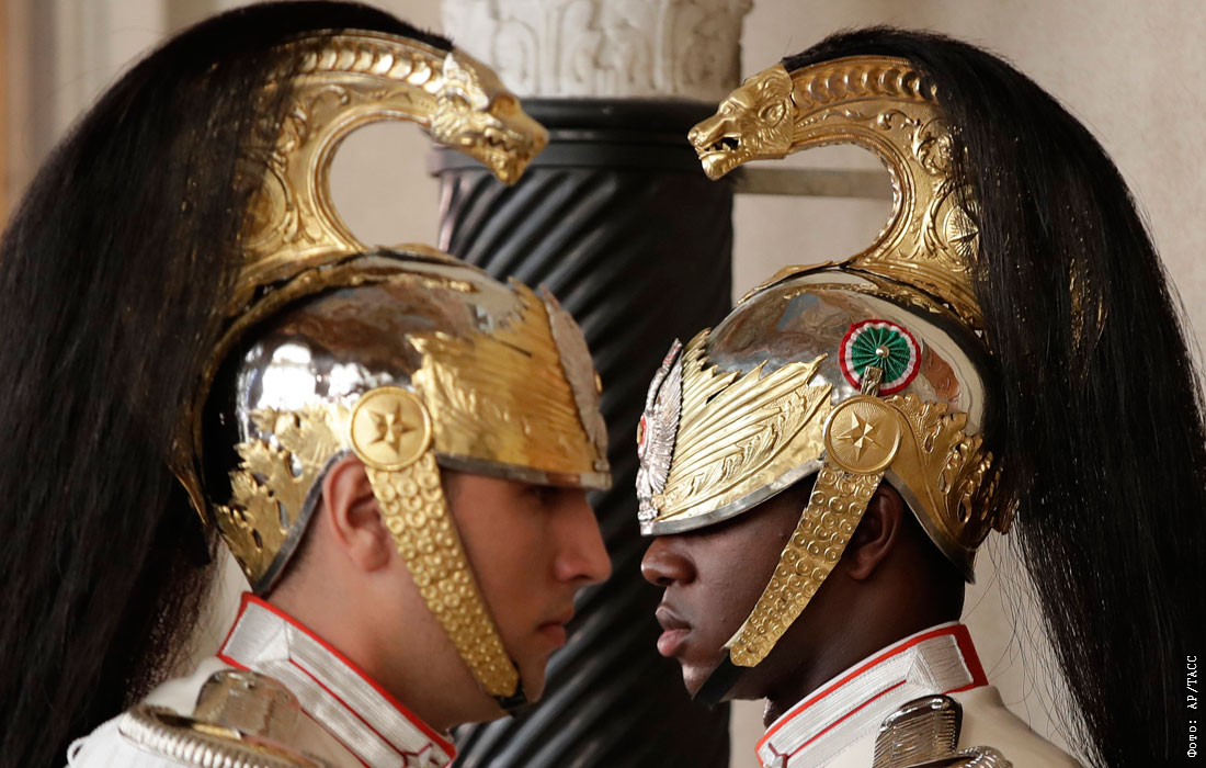 Президент Италии Серждо Маттарелла провел у себя в резиденции консультации с тремя партиями, чтобы выяснить, хотят ли они досрочных выборов или готовы сформировать новое правительство. На фото: смена караула у дверей президента