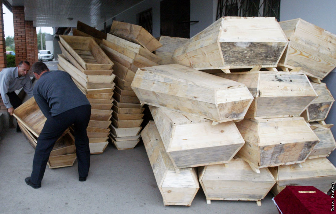 Рабочие готовят гробы для похорон первых из 333 убитых заложников, 5 сентября 2004 года