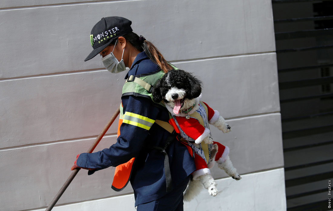 Дворник в Бангкоке работает на улице вместе с щенком - метисом пуделя и ши-тцу