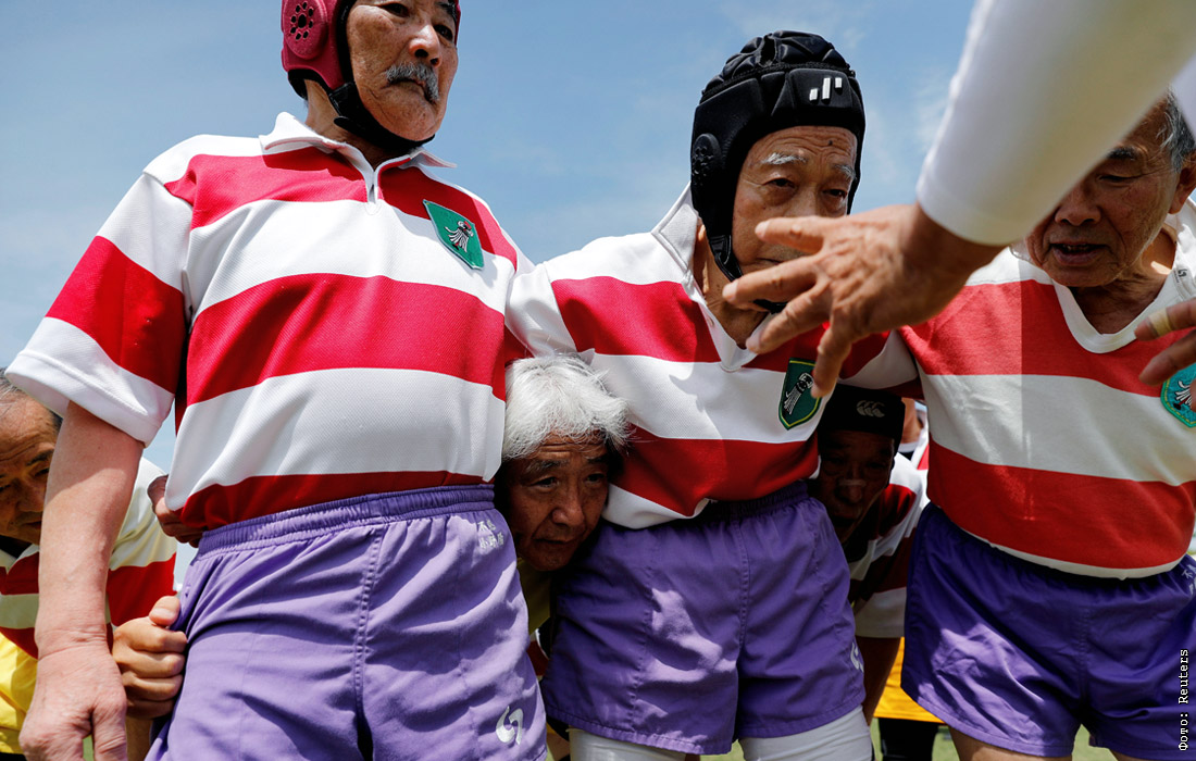 Пожилые игроки в регби тренируются перед матчем в Кумагая, Япония