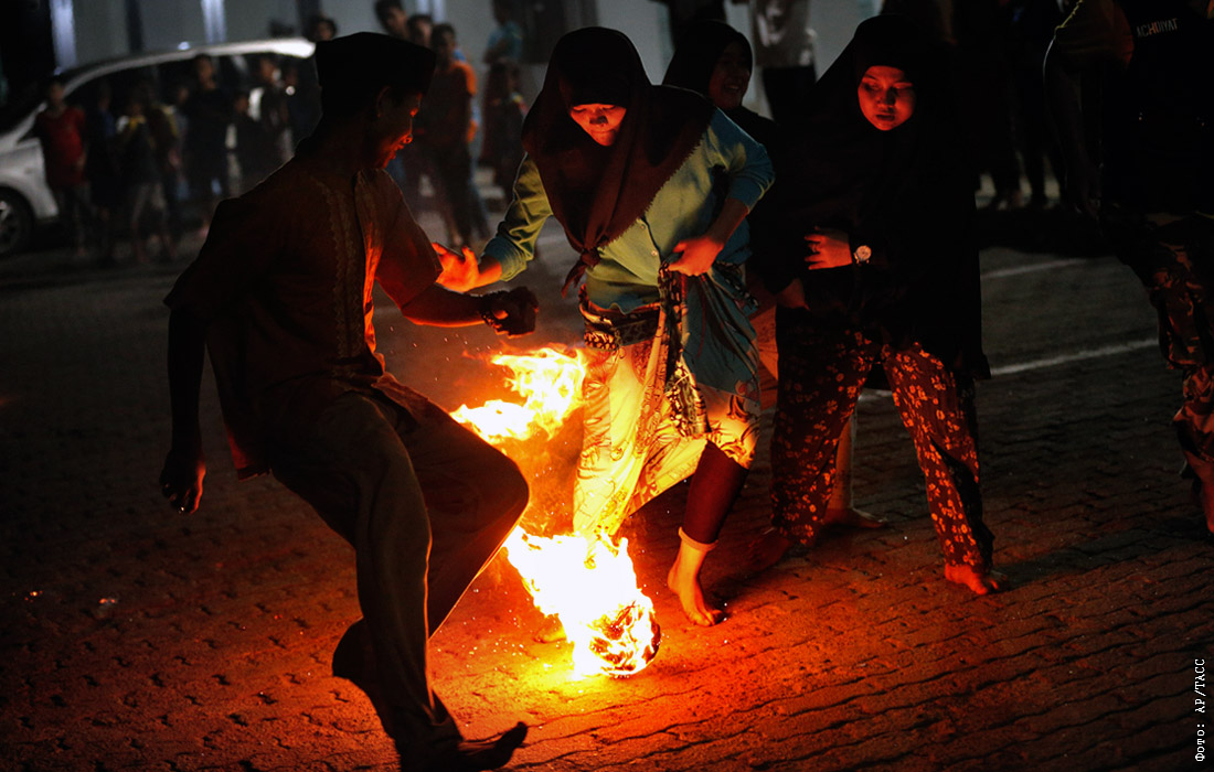 Школьники играют в футбол огненным мячом во время празднования исламского Нового года в Джакарте