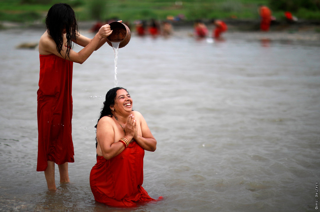 Омовение в реке Манхара во время празднования фестиваля Риши Панчами в Катманду, Непал