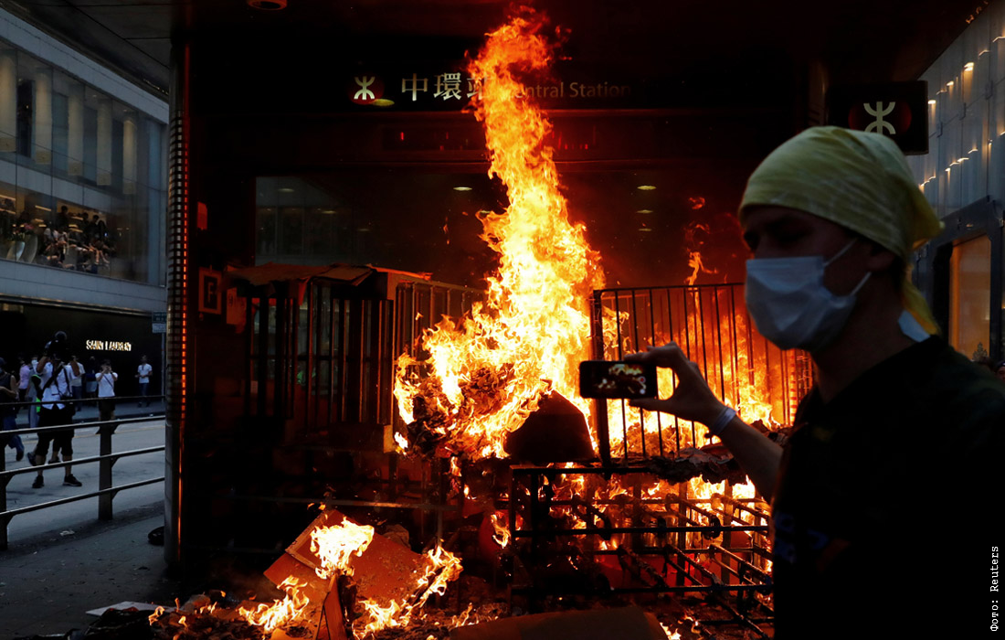 В Гонконге протестующие подожгли вход станции метро. Демонстранты требуют независимого расследования в отношении жестоких и неправомерных, по их мнению, действий полиции против протестующих.