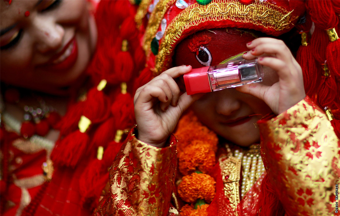 Непальская девочка в традиционном наряде принимает участие в ритуале Кумари Пуджа в Катманду