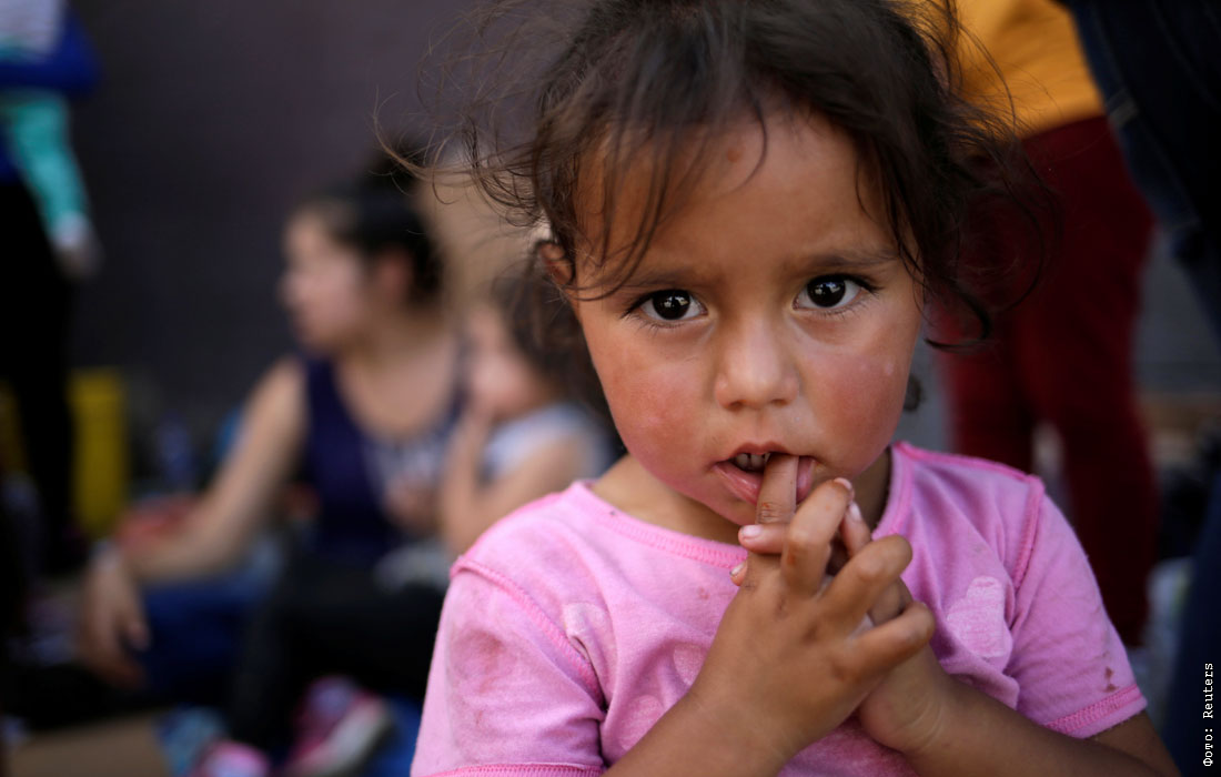 Мексиканская девочка со своими родителями ожидает в очереди, чтобы подать заявление о предоставлении убежища в США на пограничном мосту в Сьюдад-Хуарес