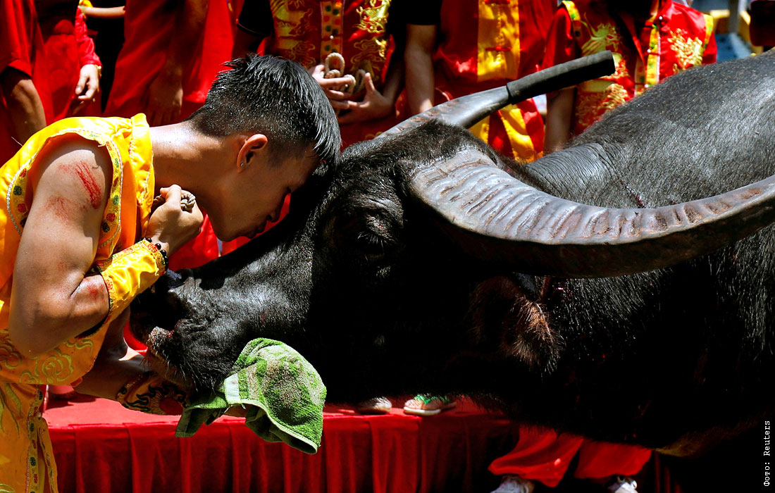 Фермер со своим буйволом после победы на ежегодном фестивале Do Son во Вьетнаме