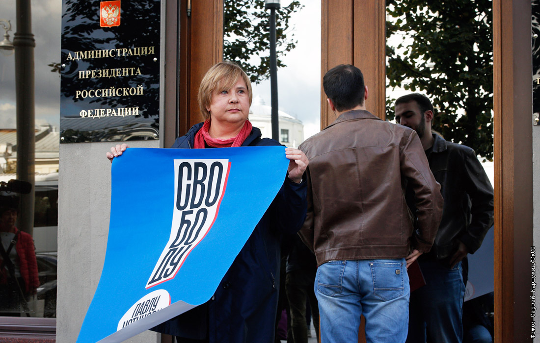 В Москве у здания администрации президента РФ проходят одиночные пикеты в поддержку актера Павла Устинова, осужденного на три с половиной года заключения по обвинению в применении насилия к бойцу ОМОНа на несогласованной акции 3 августа в центре столицы