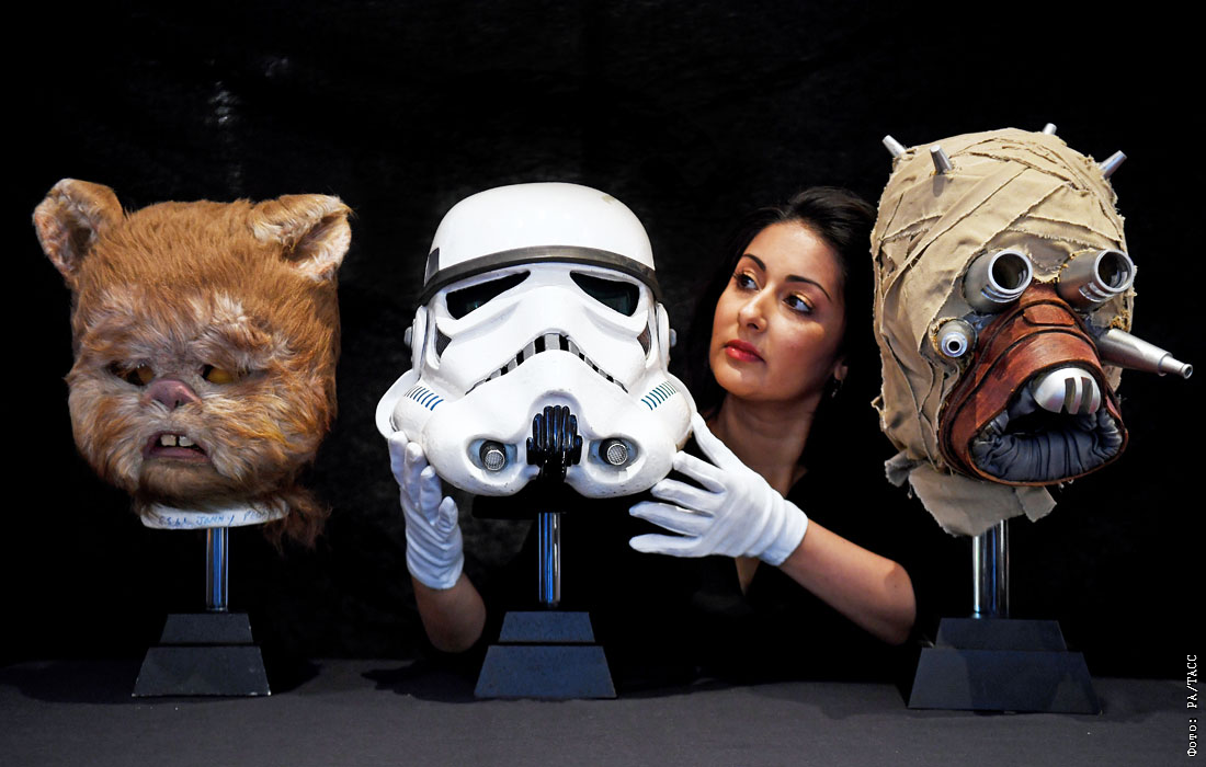 Шлем солдата-штурмовика (в центре) из фильма "Звёздные войны. Эпизод IV: Новая надежда" (1977) на выставке топ-лотов аукциона Prop Store в Лондоне, который пройдет с 30 сентября по 1 октября. На торги будут выставлены более 900 уникальных предметов реквизита и костюмов из известных фильмов и телешоу.