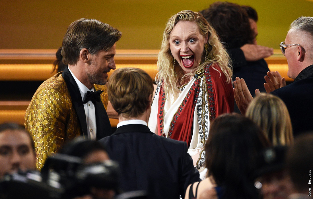Последний сезон "Игры престолов" получил премию "Эмми" как лучший драматический сериал. Конкуренцию сериалу в этой категории составили "Лучше звоните Солу", "Убивая Еву", "Поза", "Наследники", "Озарк", "Телохранитель" и "Это мы". На фото: датский актер Николай Костер-Вальдау, известный по роли Джейме Ланнистера, и актриса Гвендолин Кристи (Брианна Тарт).