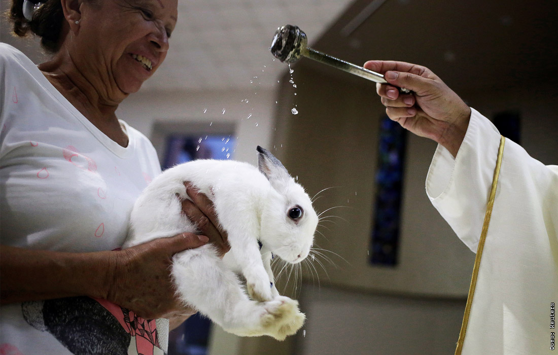 Домашний кролик получает благословение от священника в день святого Франциска Ассизского, который считается покровителем всех зверей. Муниципалитет Эскобедо, Мексика.