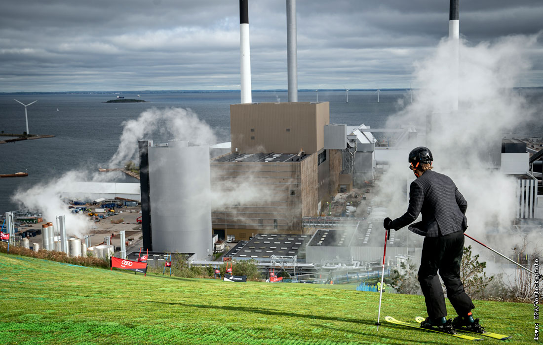 Горнолыжная трасса на крыше мусоросжигательного завода в Копенгагене
