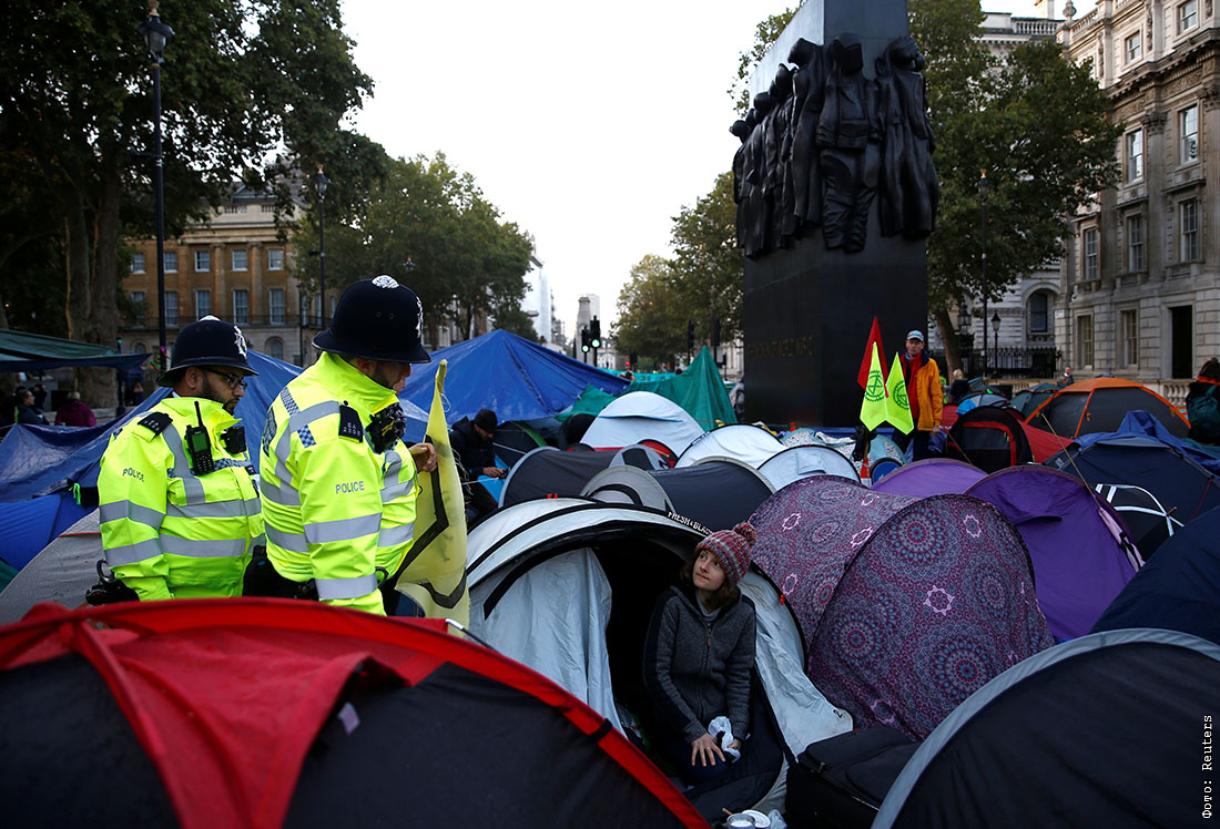 Протестующие в Лондоне заблокировали дороги, ведущие к Трафальгарской площади, набережную Виктории, на которой, в частности, расположена штаб-квартира министерства обороны Великобритании и улицу Уайтхолл, где расположены многие британские правительственные здания
