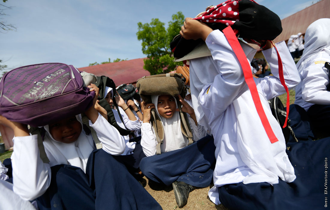 Индонезийские школьники во время учений по эвакуации при землетрясении и цунами в Банда-Ачех. Индонезия находится на Тихоокеанском огненном кольце, на которое приходится 80 процентов мировой сейсмической активности.