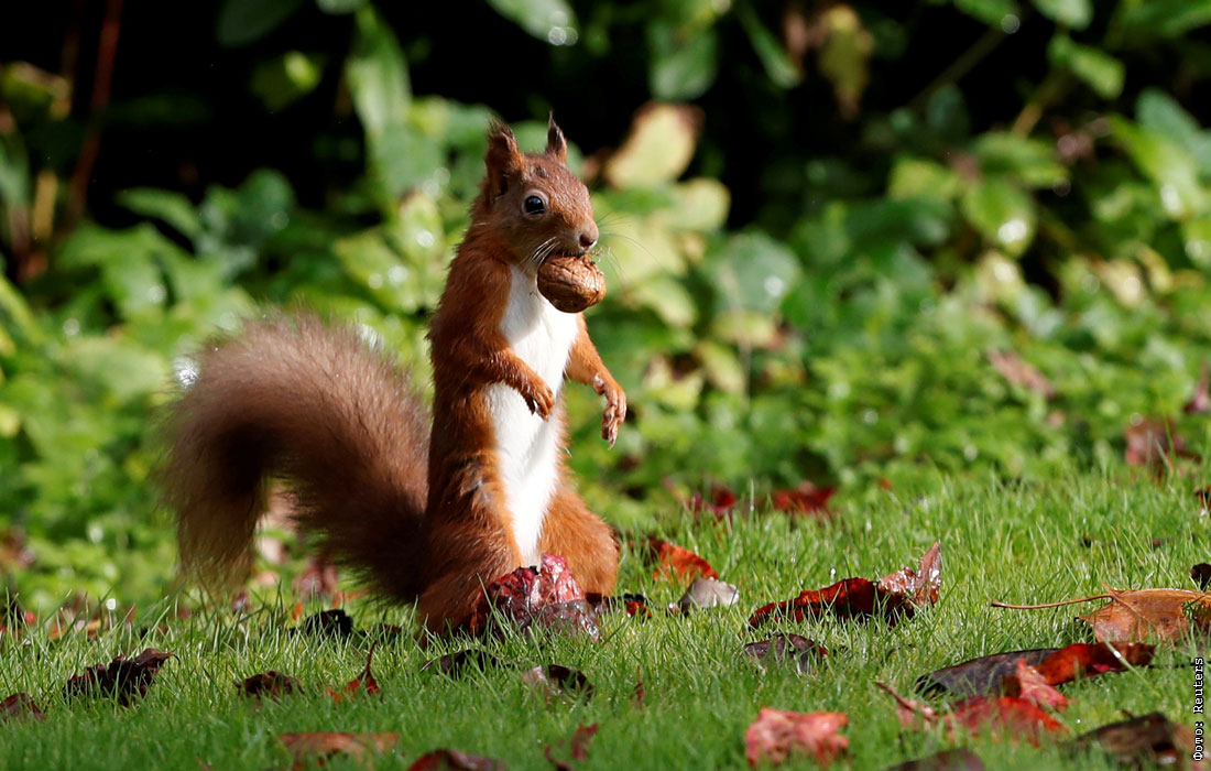 Красная белка запасается орехами в шотландском Питлохри