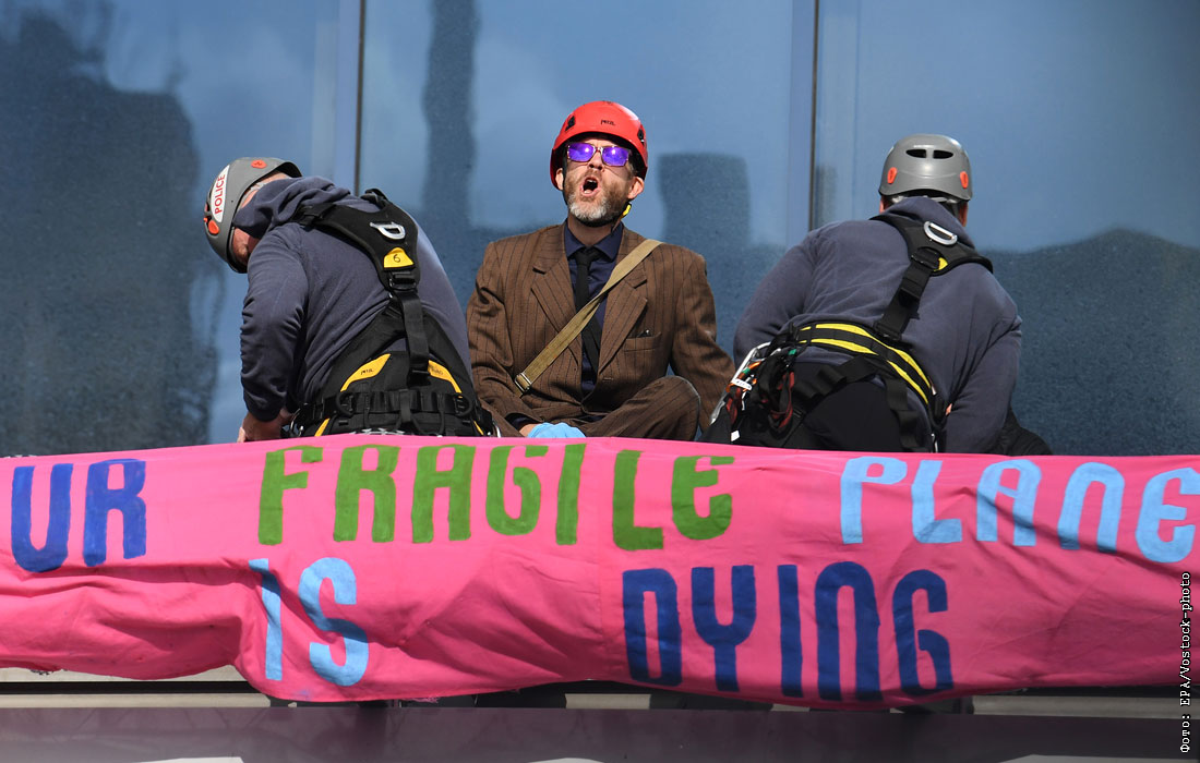 Протестующий Extinction Rebellion стоит на крыше аэропорта, пытаясь заблокировать Лондонский хаб