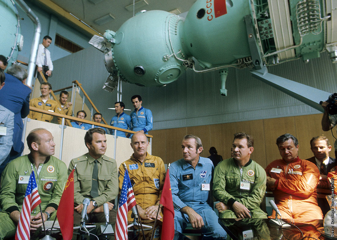 1974 год. Летчики - космонавты СССР и астронавты США (слева направо) Алексей Леонов, Владимир Шаталов, Томас Стаффорд, Вэнс Бранд, Валерий Кубасов, Анатолий Филипченко в центре подготовки космонавтов имени Юрия Гагарина.