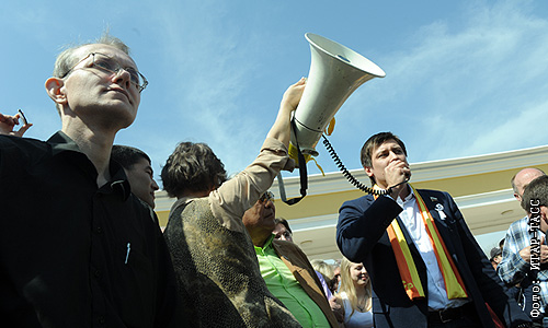 Бывший кандидат в мэры Астрахани Олег Шеин (слева) и депутат Госдумы РФ Дмитрий Гудков (справа) во время несанкционированной акции протеста против фальсификации результатов выборов мэра Астрахани.