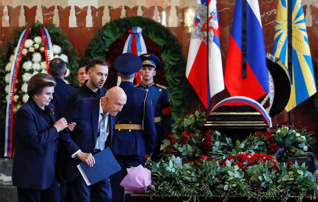 Первая женщина-космонавт, депутат Госдумы Валентина Терешкова и астронавт НАСА Томас Стаффорд во время прощания с Алексеем Леоновым