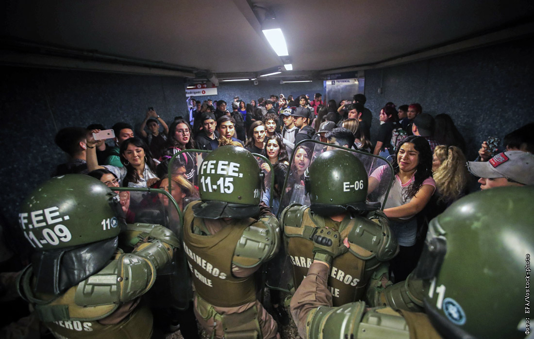 Волна протестов началась в Сантьяго около двух недель назад. Сотни школьников и студентов ездили без билетов, перепрыгивали через турникеты и устраивали акции протеста в подземке.