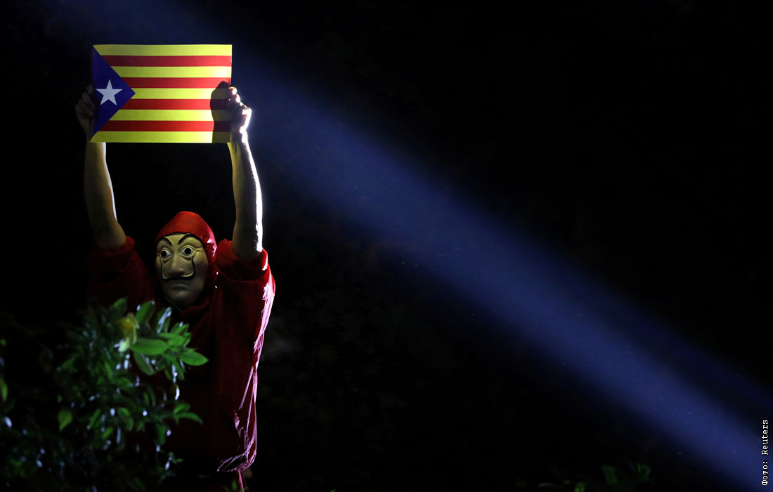 Участник акции протеста в Гонконге демонстрирует свою солидарность с движением за независимость Каталонии