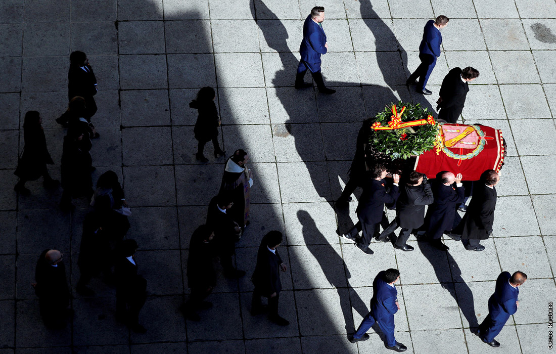 В мадридском районе Пардо завершилась церемония перезахоронения останков бывшего руководителя Испании Франсиско Франко. Гроб на вертолете был доставлен на кладбище после эксгумации из могилы в базилике в Долине Павших, затем погружен в катафалк, который в сопровождении полицейских автомобилей подъехал к месту захоронения - фамильному склепу, где сейчас покоится вдова Франко Кармен Поло.