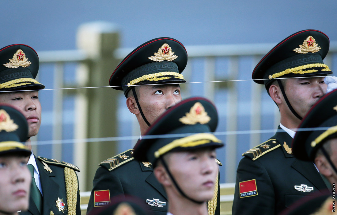Члены почетного караула Народно-освободительной армии Китая готовятся к церемонии приветствия в Большом зале народных собраний в Пекине