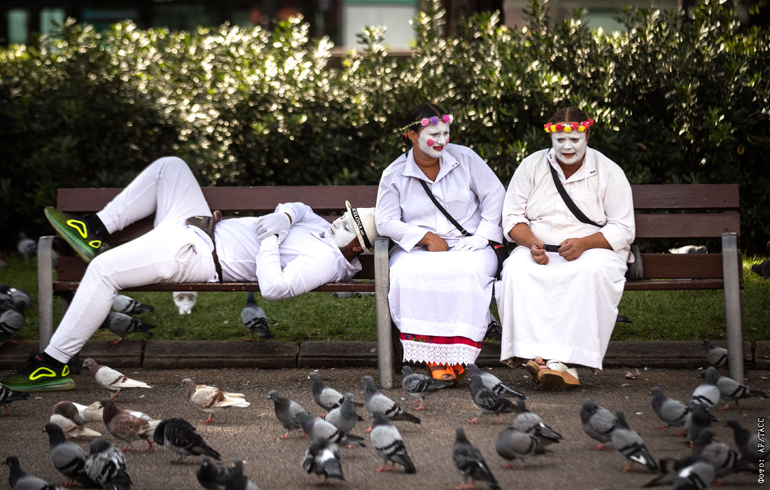 Артисты пантомимы на отдыхе на площади Каталонии в Барселоне
