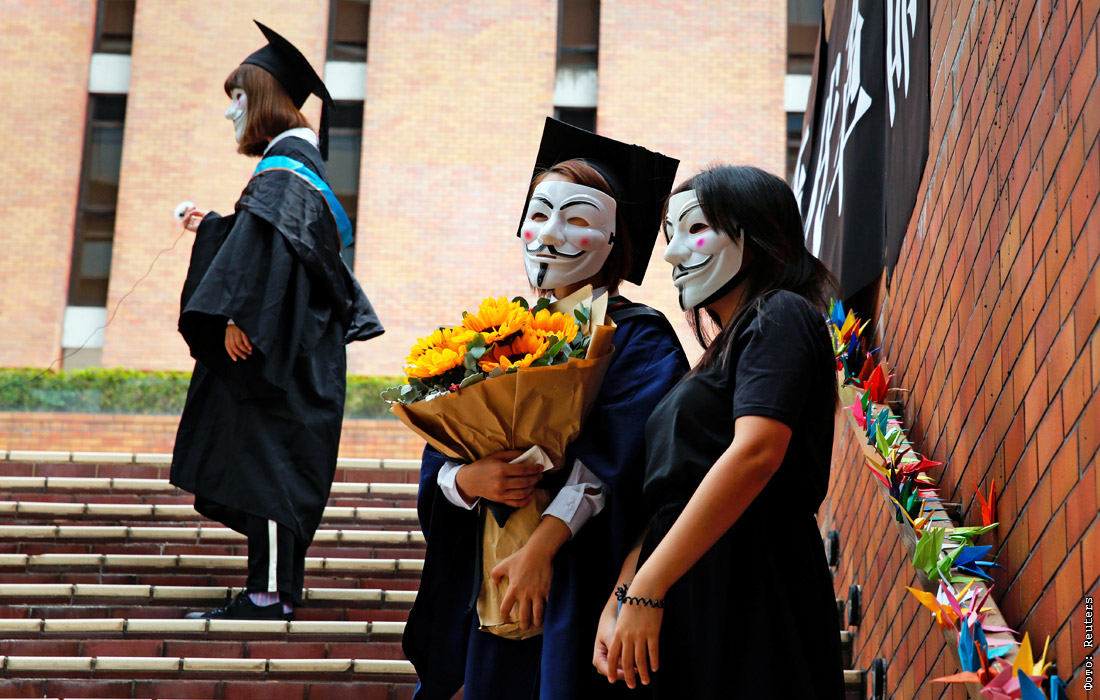 Студенты Гонконгского политехнического университета пришли на церемонию вручения дипломов в масках Гая Фокса в поддержку антиправительственных акций