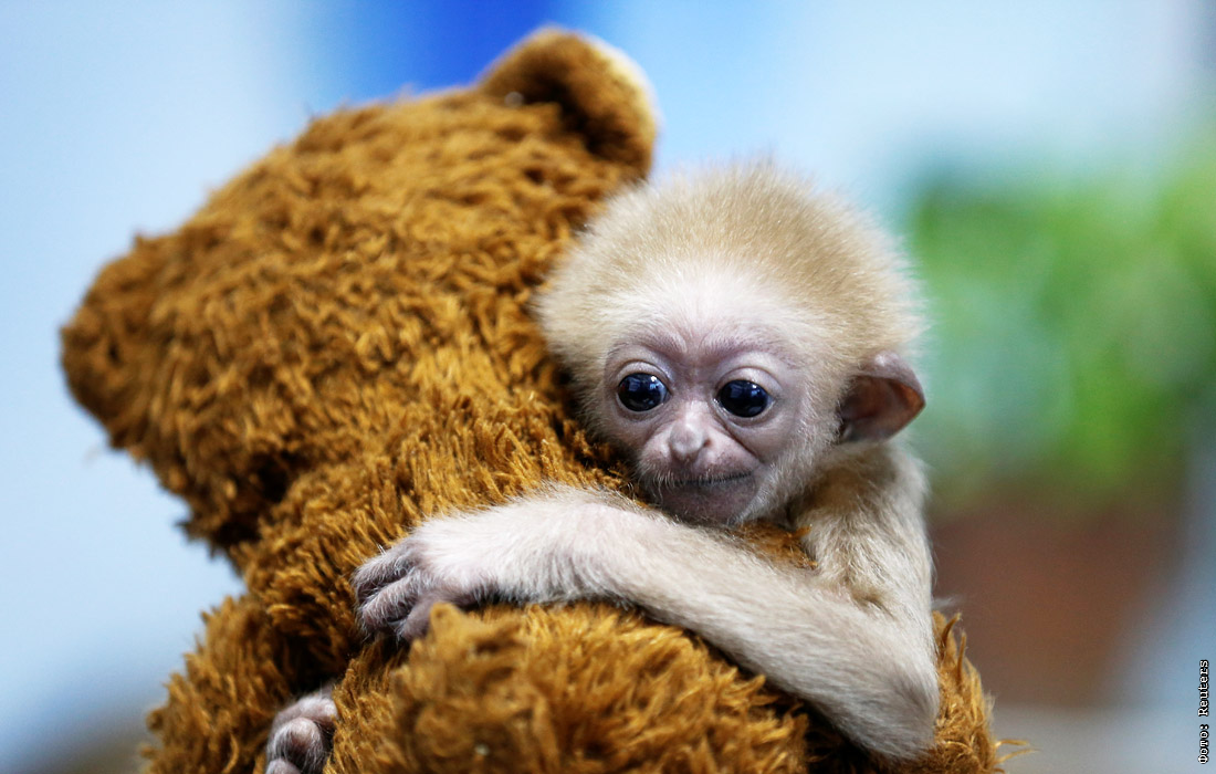 Двухмесячный гиббон по кличке Джим обнимает плюшевого мишку в зимнем вольере зоопарка в Алматы, Казахстан