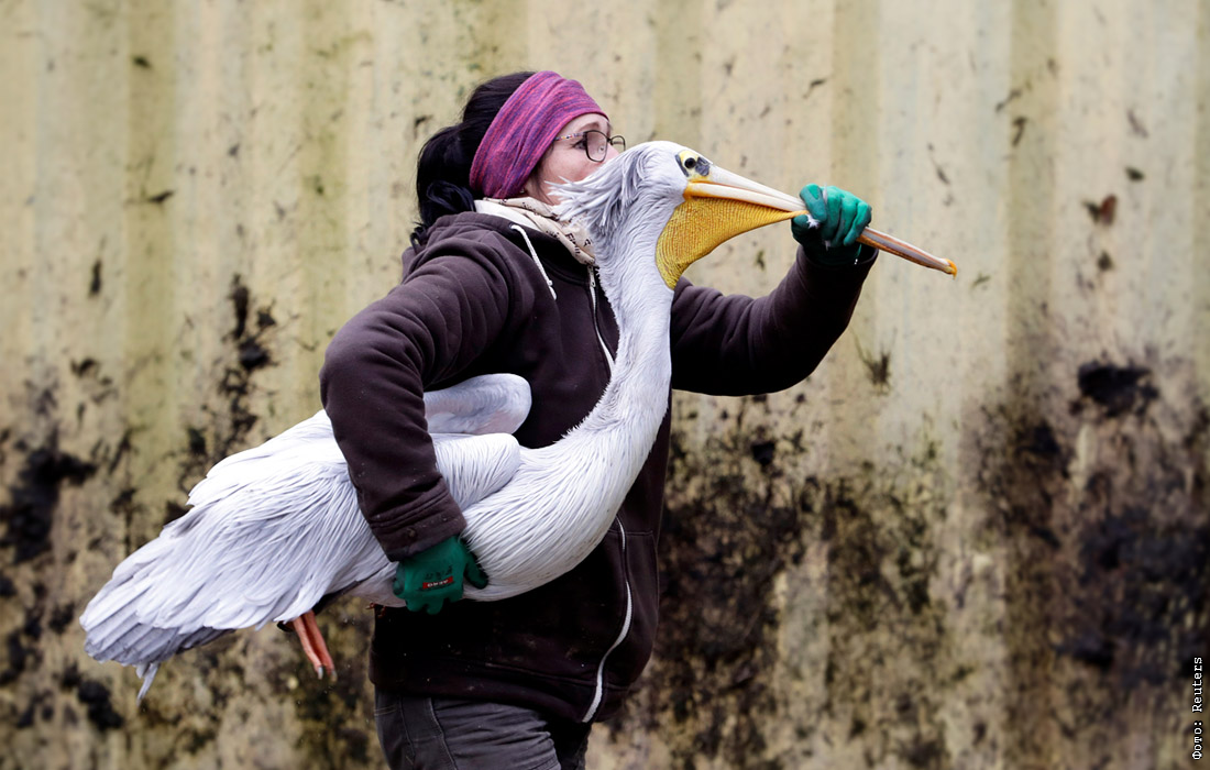 Работники зоопарка чешского Либереца отлавливают пеликанов, чтобы переместить их в зимний павильон