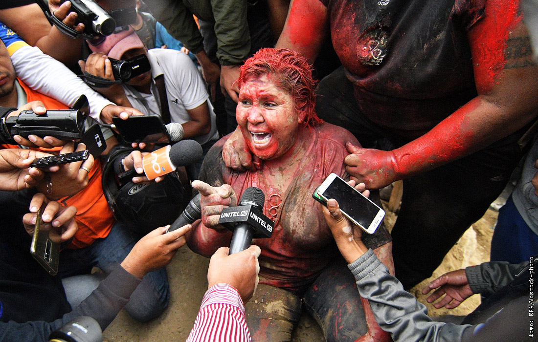 Мэр небольшого города Винто в Боливии Патриция Арсе, которая подверглась нападению со стороны оппозиционных протестующих, разговаривает со СМИ