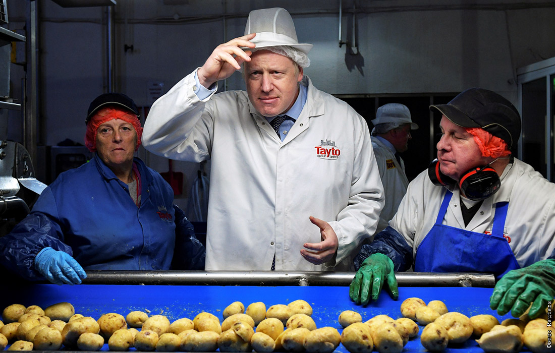 Премьер-министр Великобритании Борис Джонсон в рамках предвыборной кампании посетил фабрику по производству чипсов в графстве Арма, Северная Ирландия