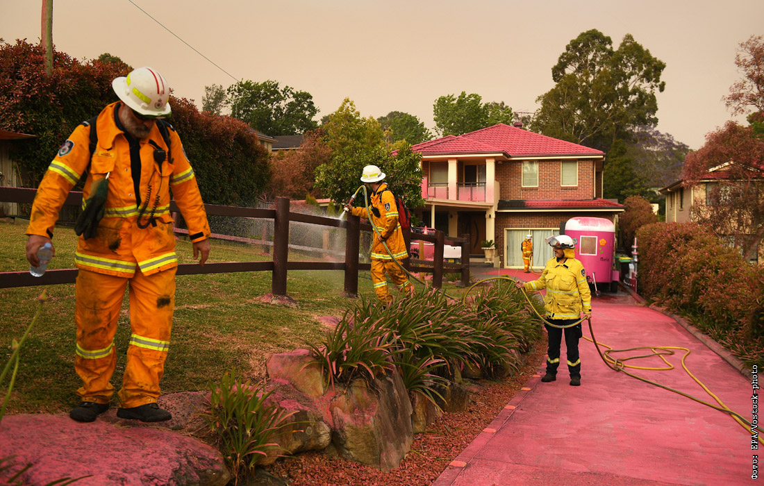 Сотрудники пожарной охраны очищают дома после распыления антипиренов - средств для защиты от огня. Новый Южный Уэльс.
