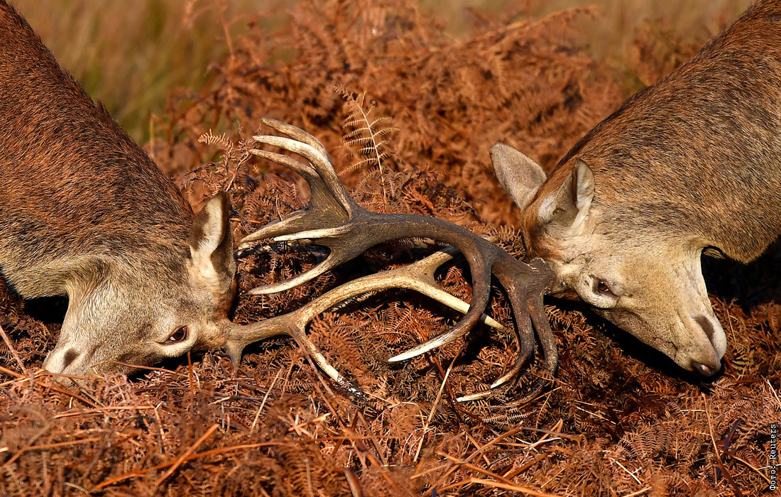 У оленей из лондонского Ричмонд парка начался сезон спаривания. Два самца сцепились рогами в борьбе за самку.
