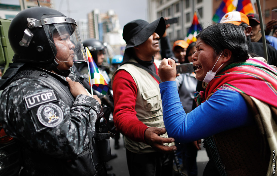Сторонники подавшего в отставку президента Боливии Эво Моралеса вышли на акцию протеста в центре административной столицы страны Ла-Паса