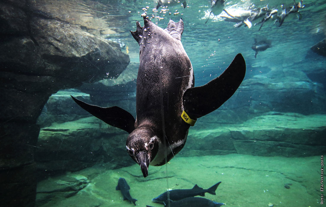 Пингвин Гумбольдта в своем вольере в зоопарке Франкфурта-на-Майне, Германия