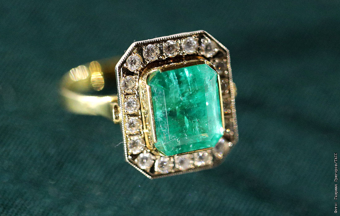 Золотое кольцо с изумрудом и бриллиантами представлено на выставке "Драгоценности Людмилы Зыкиной" к 90-летию со дня рождения певицы в Историческом музее