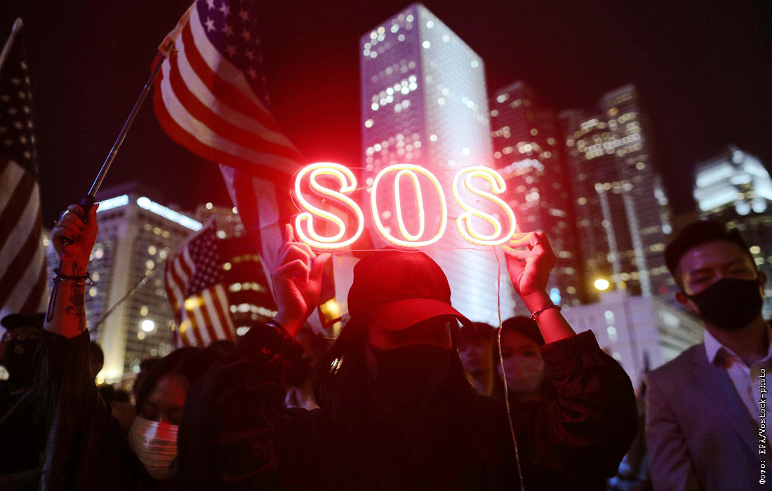 Протестующие присоединились к акции, приуроченной ко Дню благодарения, после принятия в США закона о правах человека в Гонконге