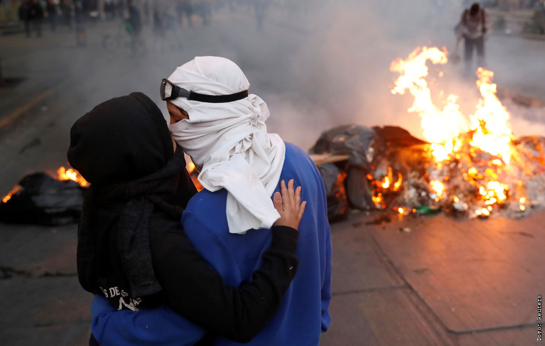 Пара демонстрантов целуется перед горящей баррикадой во время акции протеста в Сантьяго, Чили